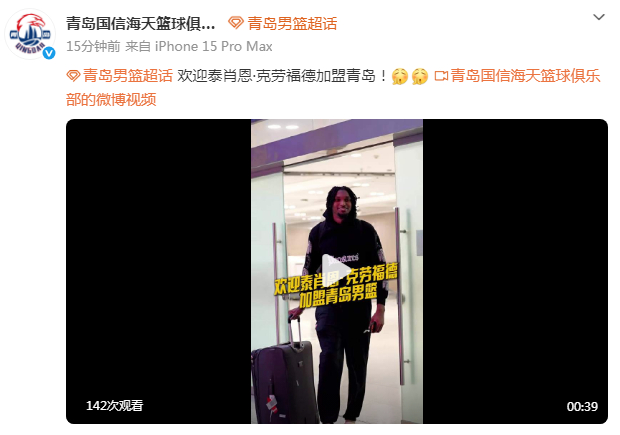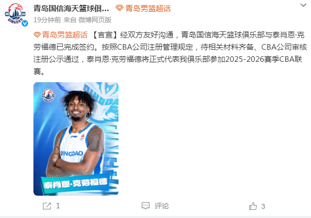 青岛男篮官方晒出泰肖恩-克劳福德加盟的海报,并且在公告写道:“经双方友好沟通,青岛国信海天篮球俱乐部与泰肖恩-克劳福德已完成签约。按照CBA公司注册管理规定,待相关材料齐备、CBA公司审核注册公示通过,泰肖恩-克劳福德将正式代表我俱乐部参加2025-2026赛季CBA联赛。​​​”
